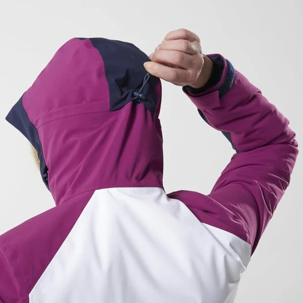 This waterproof ski jacket made of recycled fibres confirms that one can combine performance and ecodesign. With a tricoloured design adding a dynamic flair, unquestionably feminine with a fitted shape made possible thanks to the stretch properties of the fabric.