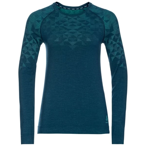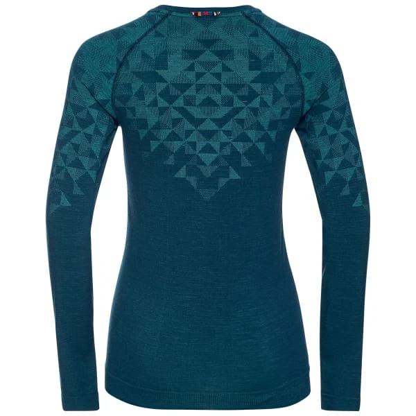 Specifically designed to accompany sportswomen in their cold-weather skiing and winter running, the BL CREW NECK KINSHIP PERFORMANCE WOOL 200 W from Odlo is a long-sleeve, scoop-necked technical undergarment for women that doubles as a comfortable wearer.